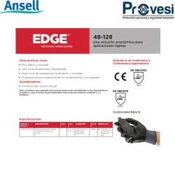 Guante Poliester Nitrilo Edge 48-128 Ansell  Ansell. Guante Ansell Edge 48-128. Muy ligero y cómodo. Gran nivel de flexibilidad y destreza. Un buen nivel de resistencia a la abrasión y a la acción de aceites y grasas. El guante de color oscuro enmascara mejor la suciedad. Características claves. Sensibilizadores. Proteínas del caucho natural. Solo un número muy pequeño de usuarios puede estar sensibilizado a este ingrediente en el guante y. por lo tanto. puede desarrollar reacciones de contacto irritantes y / o alérgicas.