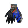 Guante en poliéster con recubrimiento contextura acanalada en nitrilo negro. Recubrimiento en nitrilo de alta resistencia con textura acanalada para un agarre superior. Soportado en poliéster azul con tejido acanalado U3 de 13 galgas. Flexible y respirable. Puño cerrado para un perfecto ajuste ergonómico. Textura Acanalada