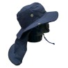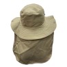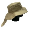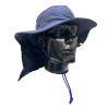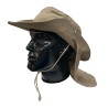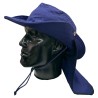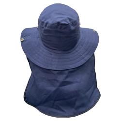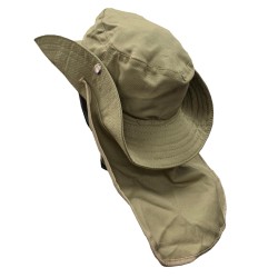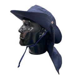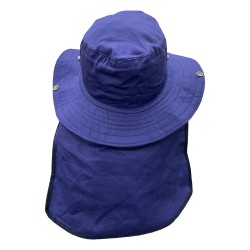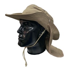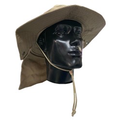 Sombrero Tipo Safari con Cubre Nuca Fabricado en Dril con cordón ajustable. •Safari en dril, 65/35 poliéster/algodón con un peso de 245 gr/ m2 •Ala de 8cms de ancho •Copa de 9.5 Cms de alto 20 cms diámetro •Capa en dril, ribeteada en sesgo de tela •33 cms ancho y 23 cms largo •Diámetro 35 cms •Tapa costura en tela para la copa •Broche metálico •Cordón y puntera plástica ajustable. No Inlcuye Bordado